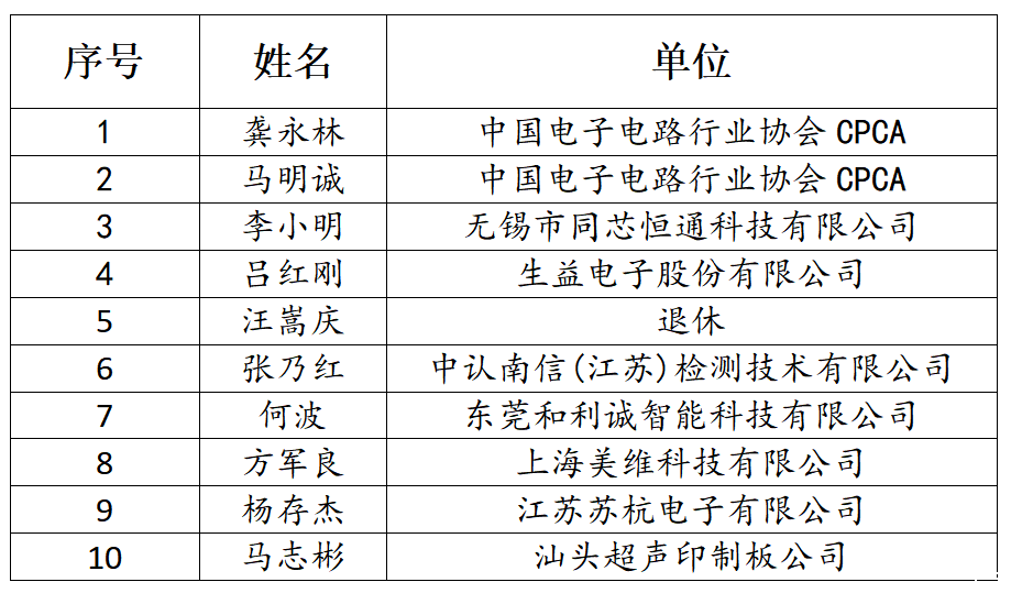 本年度新进委员8名,分别是南亚新材料粟俊华、湖南维胜黄灿、康源电子杜军、苏州维嘉孟凡辉、无锡同步电子唐鹏、临安鹏宇朱晓东、浙江振有青榆、广东骏亚何立发。现有领导小组成员6名,委员90名,总计96名。