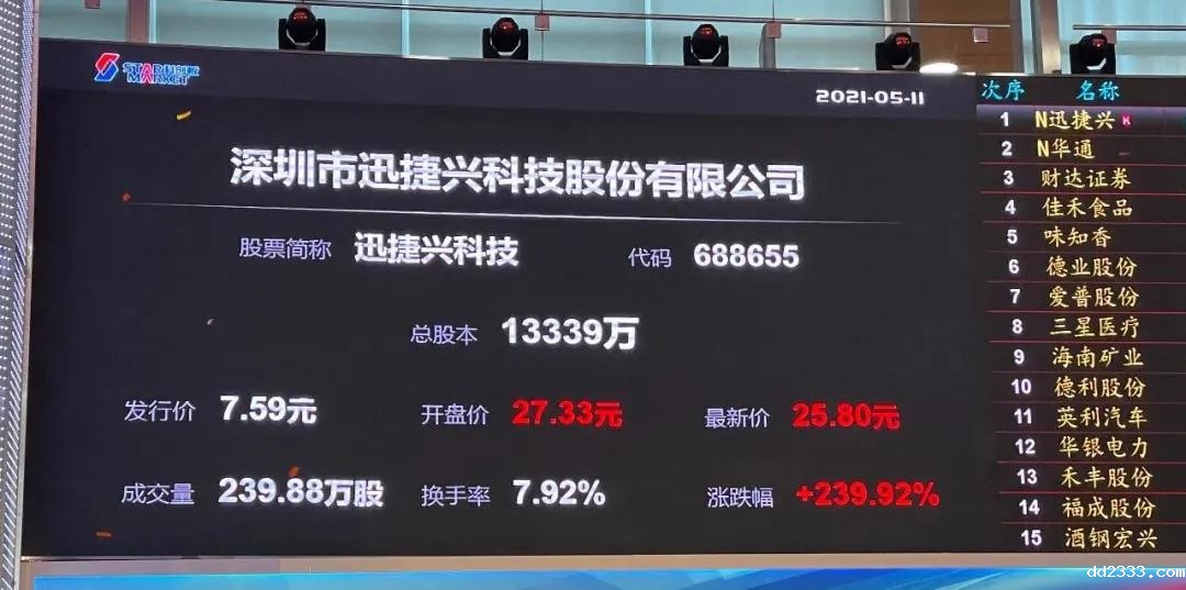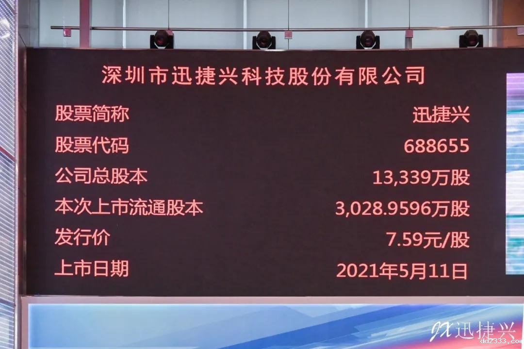 深圳市迅捷兴科技股份有限公司在上海证券交易所科创板上市,简称为迅捷兴(代码:688655)。公司本次公开发行的股票数量为3339万股,公开发行后的总股本为13339万股,发行价格为7.59元/股,对应市盈率为20.35倍。