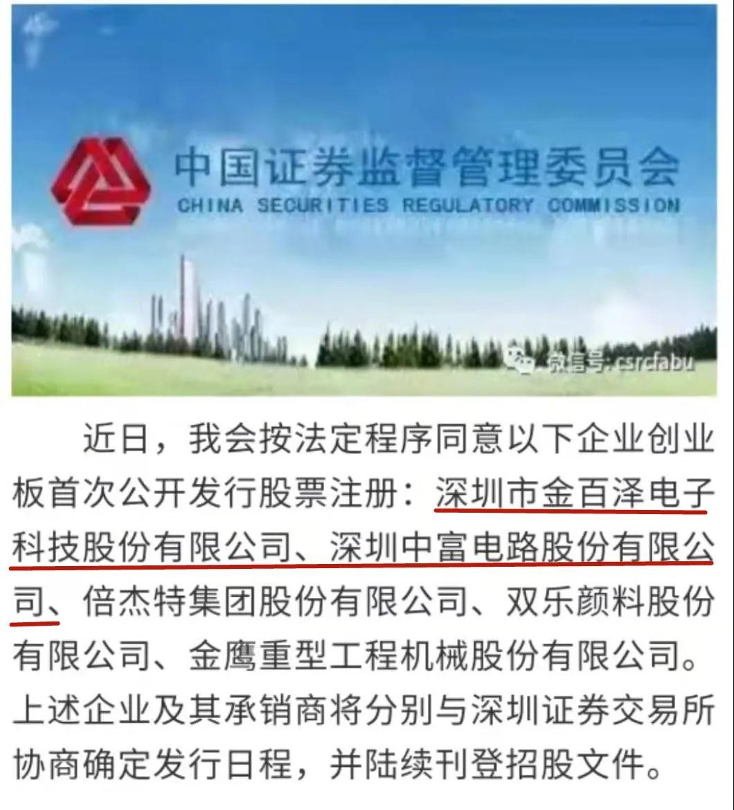 证监会发布消息称,近日,证监会按法定程序同意深圳市金百泽电子科技股份有限公司(以下简称金百泽)、深圳中富电路股份有限公司(以下简称中富电路)等五家企业创业板首次公开发行股票注册。