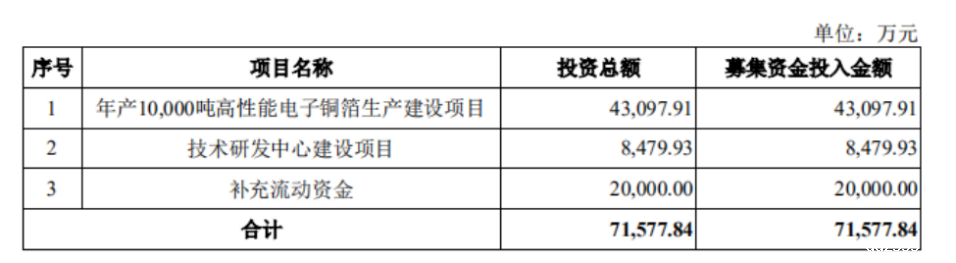 具体来看,用于年产10,000吨高性能电子铜箔生产建设项目拟使用募集资金43,097.91万元,本项目实施后公司将新增10,000吨/年的高性能铜箔产品产能,增强公司在行业中的竞争力。