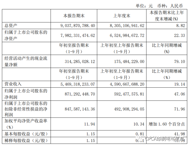 10月25日,福斯特发布《2020年第三季度报告》,报告显示,2020年福斯特前三季度实现营业收入54.69亿元,同比增长19.14%;归属于上市公司股东的净利润8.71亿元,同比增长47.06%;归属于上市公司股东的扣除非经常性损益的净利润8.48亿元,同比增长71.96%。
