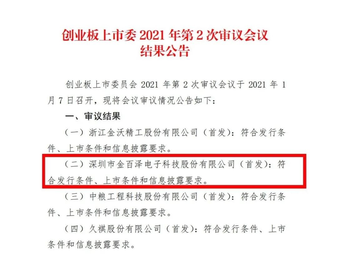 今天,行业再次传来好消息。据深交所消息,深圳证券交易所创业板2021年第2次审议会议于1月7日召开,根据审议结果显示,深圳市金百泽电子科技股份有限公司(以下简称“金百泽”) IPO成功过会。