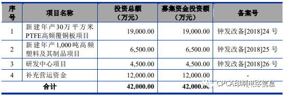 据招股书显示,中英科技拟募资4.2亿元,投建于新建年产30万平方米PTFE高频覆铜板项目、新建年产1,000吨高频塑料及其制品项目、研发中心项目以及补充营运资金。