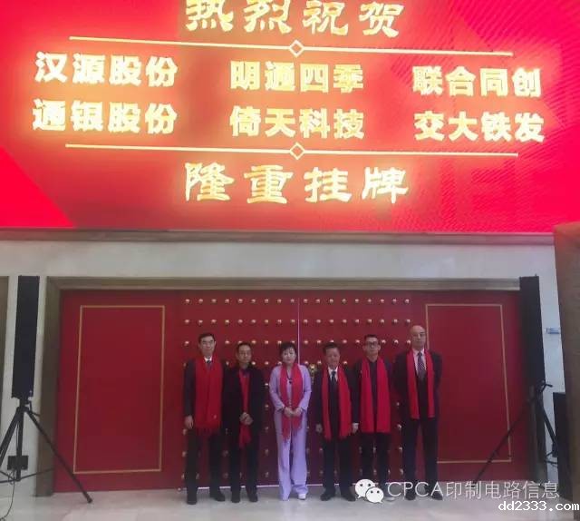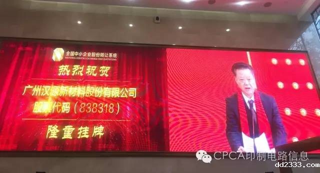 2016年电子电路行业发展亮点绝对少不了众多企业登陆资本市场。11月21日,CPCA常务理事单位、专用材料分会副会长单位广州汉源新材料股份有限公司正式挂牌新三板,CPCA秘书长张瑾、副秘书长洪芳应邀出席。