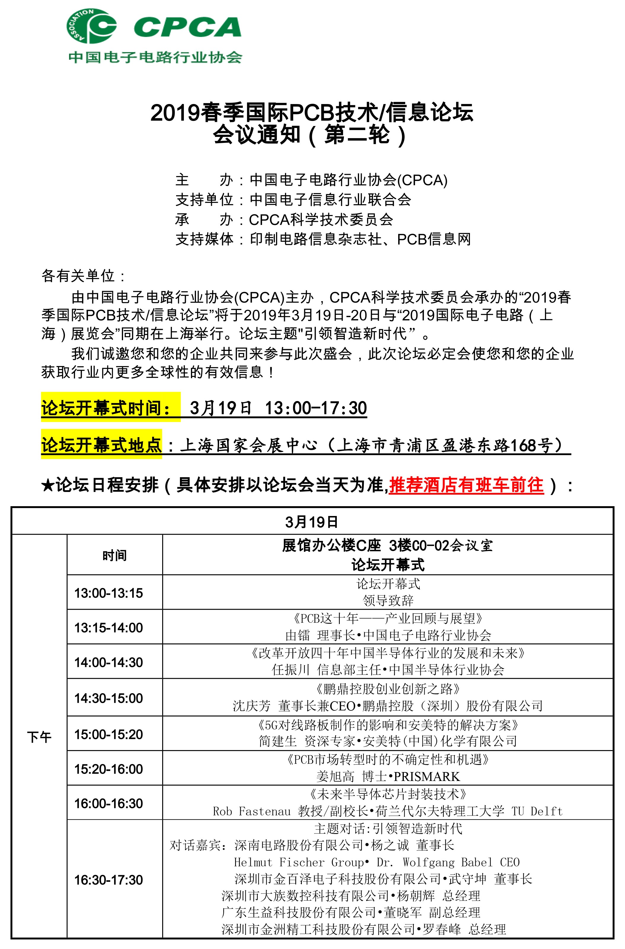 2019春季国际PCB技术/信息论坛 会议通知(第二轮)