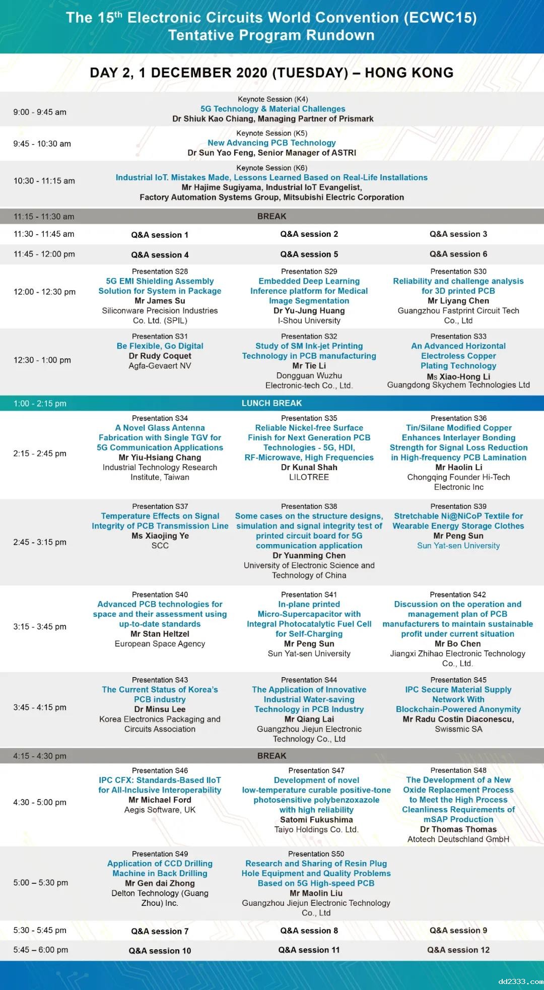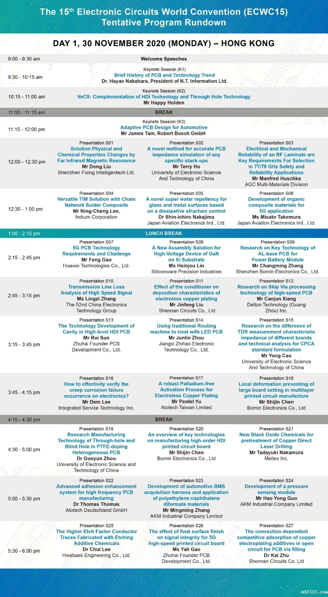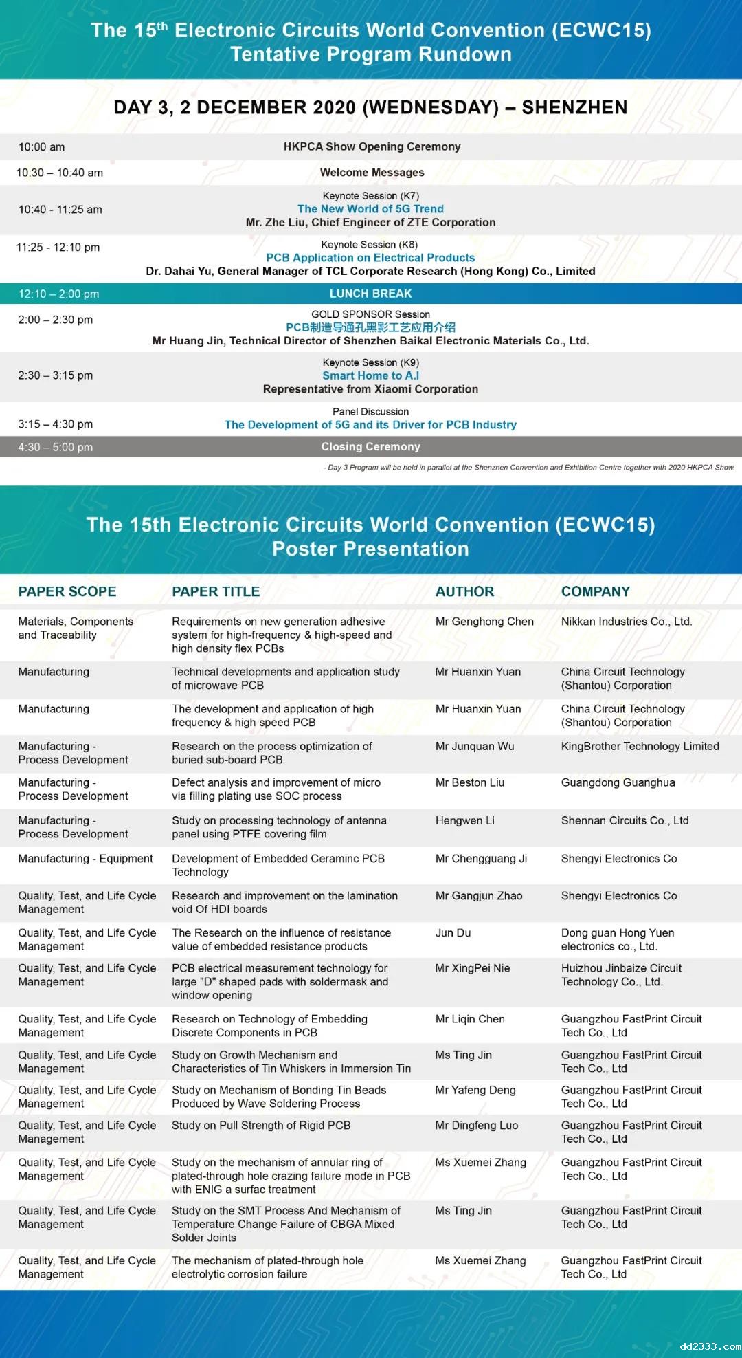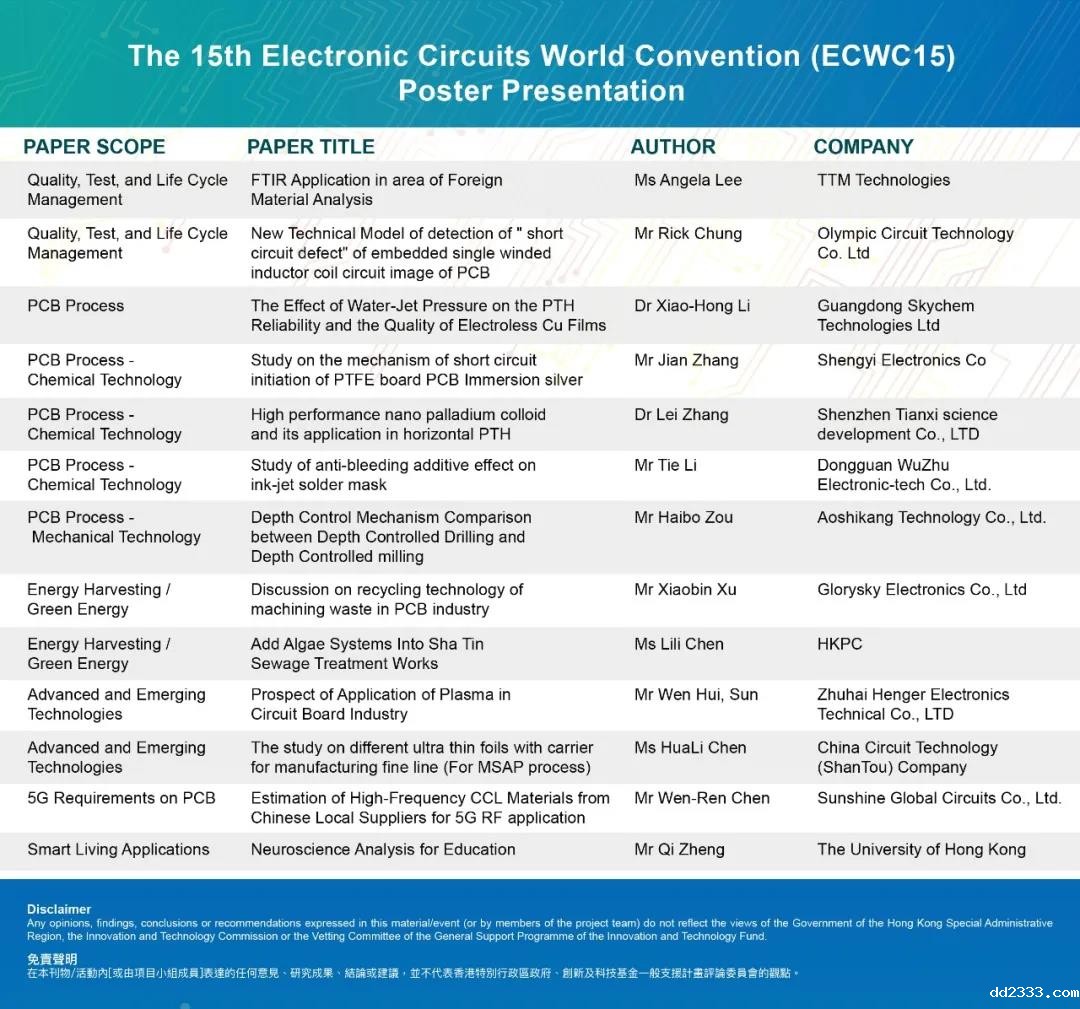 世界电子电路大会(ECWC)为世界电子电路理事会 (WECC)每三年举行一次的国际研讨会。距今已举办14届,第15届大会由香港线路板协会举办,于2020年11月30至12月2日以在线形式举行(其中第三天的会议将会在中国深圳会展中心 ,与2020国际电子电路 (深圳) 展览会同期进行)。ECWC15聚集世界各国学术、行业和政府的专家学者、技术人员参与及分享,形成一个共同探讨电子电路领域最新技术和发展的互相交流平台。会议现正进行登记,欢迎踊跃参与!