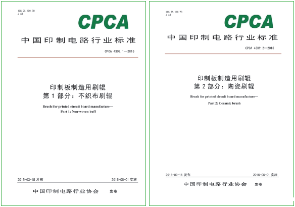 CPCA 4309.1-2015《印制板制造用刷辊 不织布刷辊》和CPCA 4309.2-2015《印制板制造用刷辊 陶瓷刷辊》于2015年3月15日发布,2015年5月1日实施。