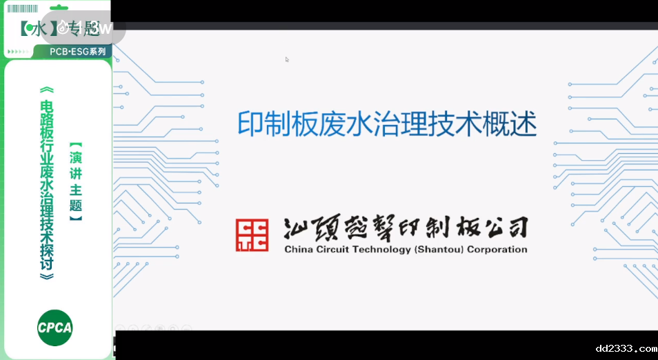 2023年2月22日下午,CPCA开启PCBESG系列——【水】专题,邀请汕头超声印制板公司环保工程师庄焕镇作主题为《电路板行业废水治理技术探讨》的演讲。本次专题演讲采取线上直播形式,由CPCA会员部任晋林主持。演讲嘉宾:汕头超声印制板公司环保工程师 庄焕镇演讲主题:电路板行业废水治理技术探讨庄焕镇,现任汕头超声印制板公司环保工程师,长期从事印制板行业废水、废气、中水、纯水等多个环保项目的规划、设计、建设及运营管理,参与节能、减排等清洁生产审核及ISO14001环境管理体系、社会责任体系认证工作。图片广告与正文无关印制电路板产…