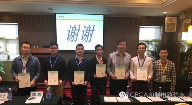 本场次结束后,主持人白亚旭为演讲者们颁发演讲证书并合影。共有6场演讲,演讲者有深圳板明丁杰、深圳瑞世兴钟汝泉、兴森快捷周波、兴森快捷陈娟、深南电路唐昌胜、景旺电子张军。